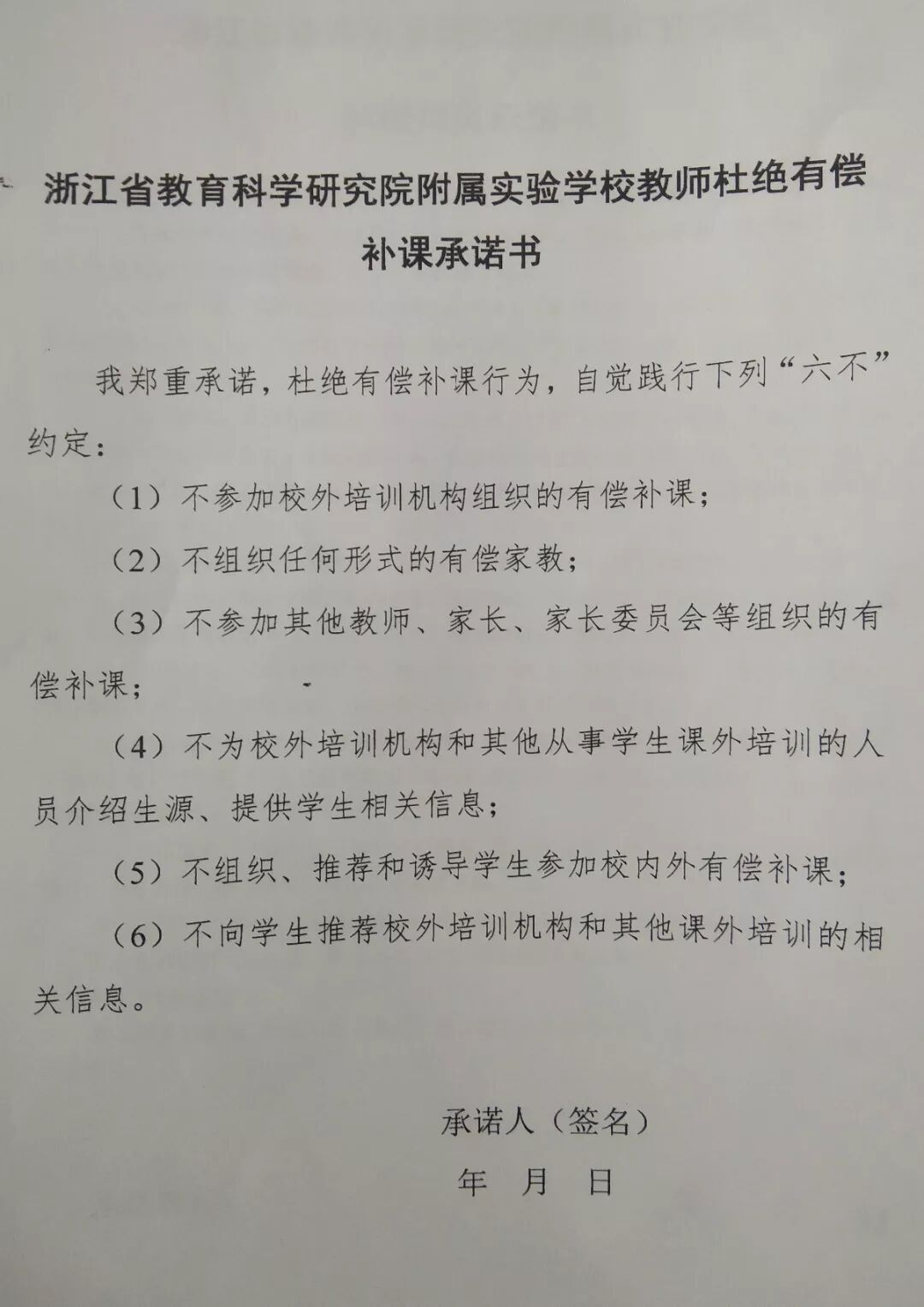 全体教师学习并签署《浙江省教育科学研究院附属实验学校师德师风承诺书》和《浙江省教育科学研究院附属实验学校教师杜绝有偿补课承诺书》。