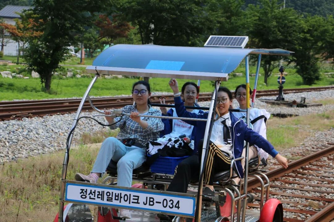 瞧,附校学子正驾着“敞篷火车”在昌平的郊外行驶着。其实这是全靠人力的“天然无公害”轨道自行车,一路上宁静秀丽的景色和特殊的自行车体验使同学们兴奋不已。