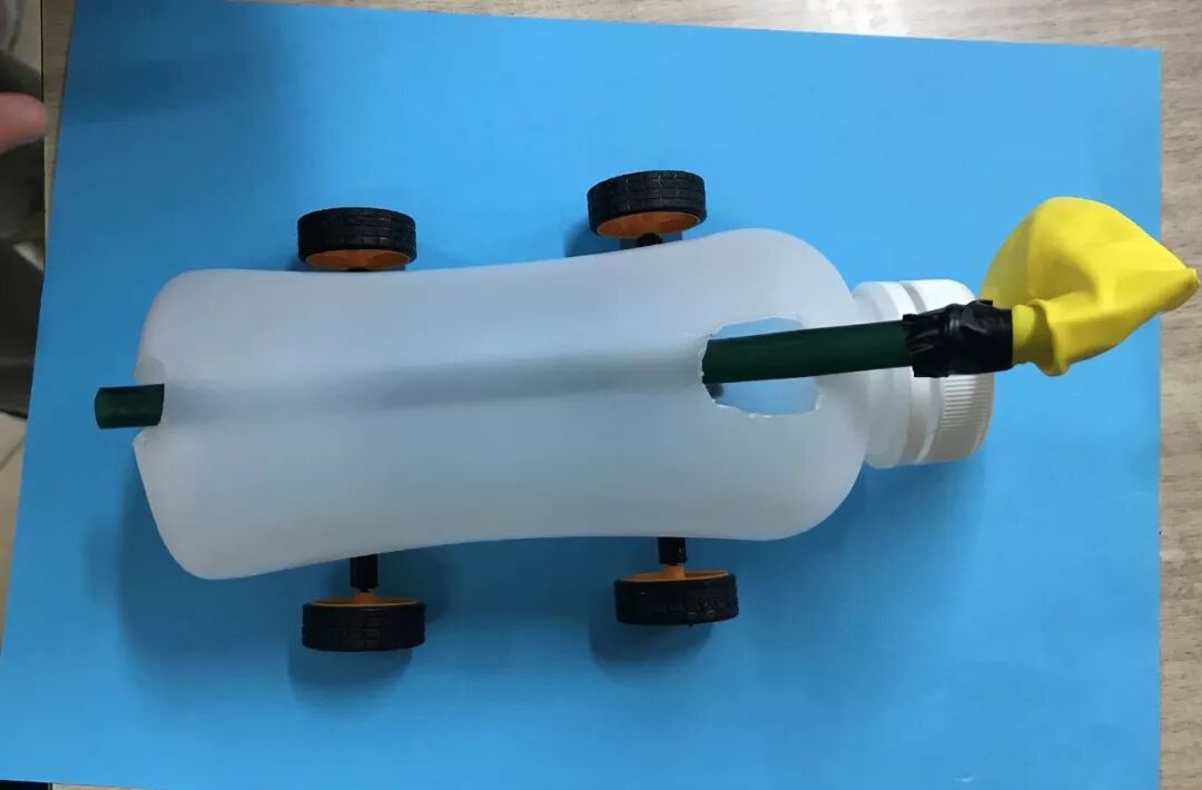 我们利用废弃矿泉水瓶来制作,通过吸管给气球吹气鼓起来,按紧吹气口,再把车子放在地上,气球反冲车就会很快地向前跑起来,而且动力十足的样子哦。