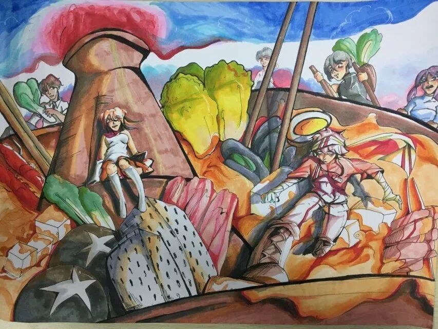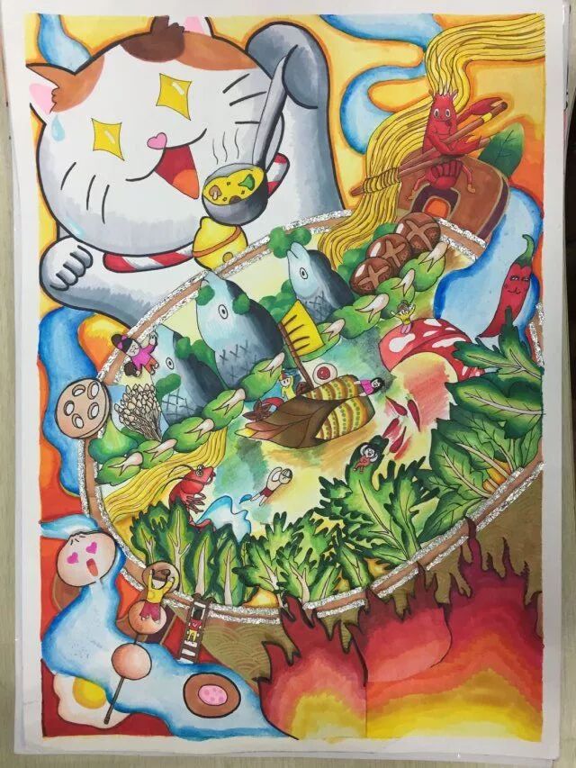今年的国际动漫画比赛内容可以画美食畅想哈哈!吃可是我的一大爱好,在这寒冷的冬天里,人们最爱吃的莫过于热气腾腾的火锅了。你猜对啦!我画的就是《火锅里的风景》。你瞧那鲜美的鱼头代表着巍巍青山,金黄的竹笋变成了一叶小舟,插上一片脆脆的豆腐皮(帆),悠悠地荡漾在湖(汤)中央,引来可爱的招财猫和我们一起分享这份美食。在此我要感谢美丽的陈捷老师,在的精心指导下,我的画面更亮丽,更吸引人了