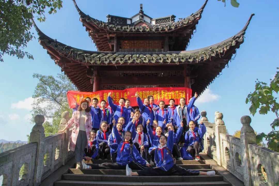 眼前的景色如诗如画,同学们被这美丽的秋色所感染,兴高采烈地在打卡景点之前进行合影。