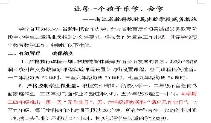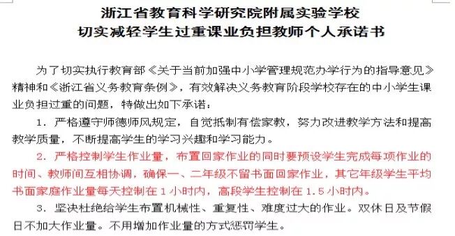 2010年,省教育厅发布了《浙江省教育厅关于切实减轻义务教育阶段中小学生过重课业负担的通知》。通知中明确规定:“(二)严格控制学生作业量小学一、二年级不得留书面家庭作业,其他年级学生平均水平书面家庭作业量每天控制在1小时以内。初中学生平均水平书面家庭作业量每天不得超过2小时。学校须按年级做好各学科作业的平衡工作。