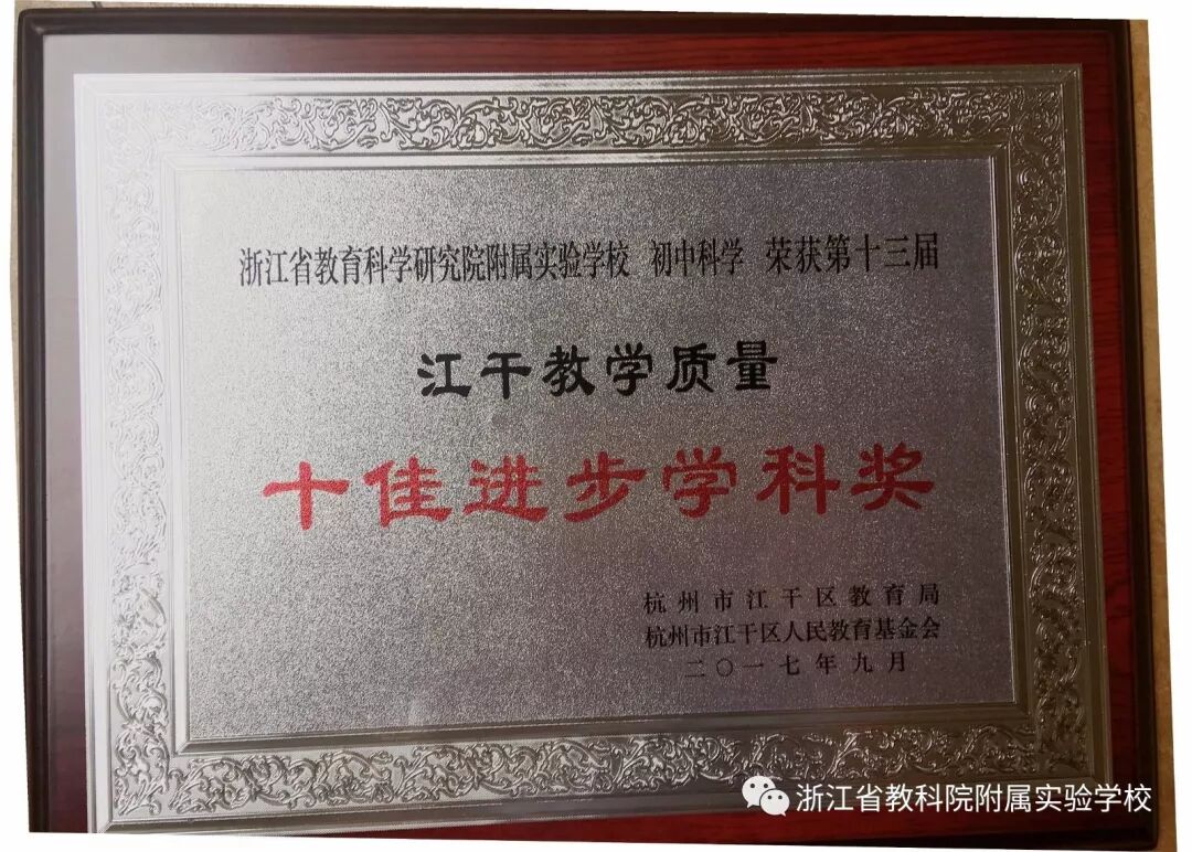 初中科学荣获江干教学质量十佳进步学科奖