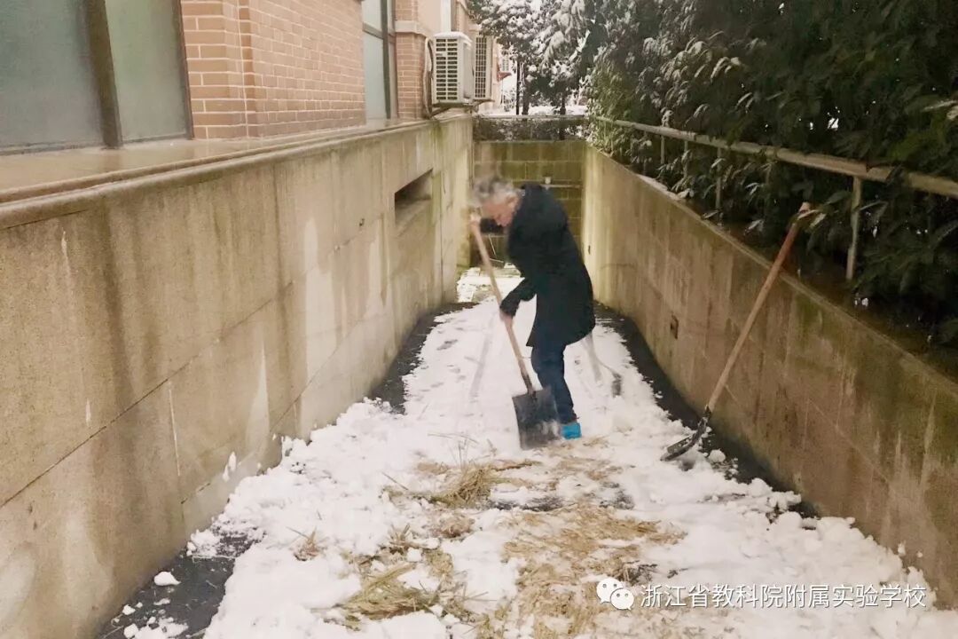 从前天下午起,杭州迎来的新年第一场强降雪,连续下了20多小时,主城区的降雪量已经达到了5-12厘米。省教科附校园的道路上同样铺满了厚厚的积雪。银装素裹的学校固然美丽,但是积雪造成了不少安全隐患,也给老师和学生带来了诸多不便。 于是,省教科附的党员教师积极响应十九大精神的号召,天蒙蒙亮就从家里出发,冒着大雪赶往学校。有些党员同志提早一个小时出门,以确保能在教师和学生来校前清出一条校园安全路来。  书记带头干。